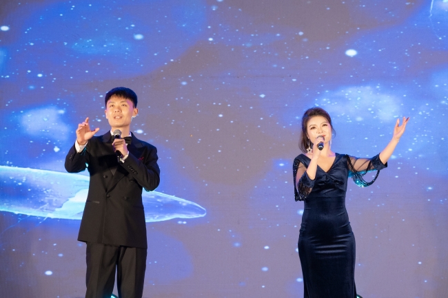 此外,晚会还融入了快板《花唱绕口令》、歌舞《龙文》、群舞《荷语清风》等多种艺术形式,展现艺术的多样性与包容性;男声独唱《别来无恙》和二胡齐奏《万马奔腾》分别以其深情的歌声和激昂的乐声,触动观众心弦;男女声二重唱《星辰大海》则以动听的歌声和深情的演绎,展现浪漫与美好。整场晚会精彩纷呈,让人流连忘返。节目最后,全体演员携手登台,共同演唱《我和我的祖国》,将晚会氛围推至巅峰。在全体观众热烈的掌声中,这场充满艺术熏陶与民族大爱的晚会圆满落幕。