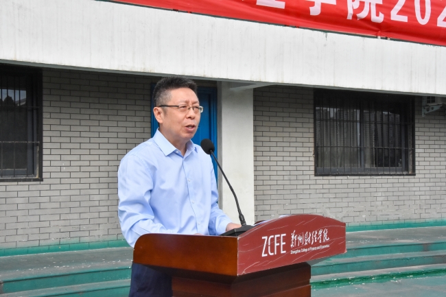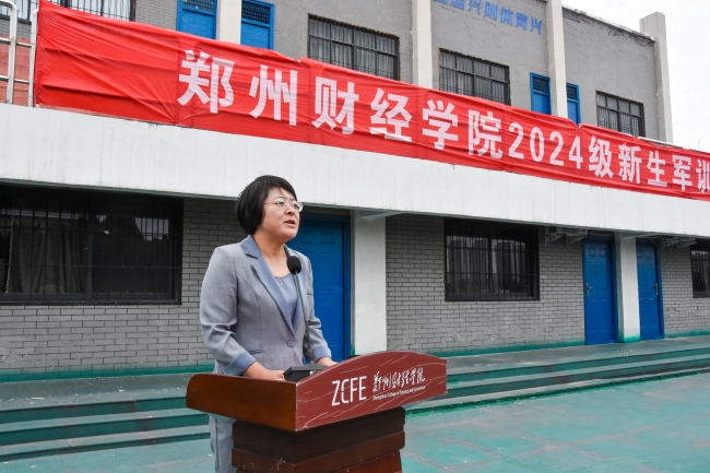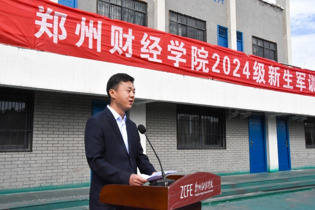 校党委副书记董学力宣读《郑州财经学院办公室关于表彰2024级新生军训先进集体及个人的决定》,并向他们表示祝贺。