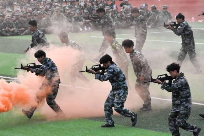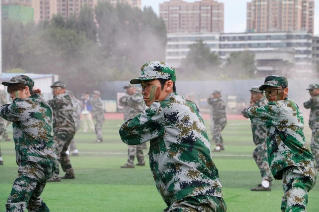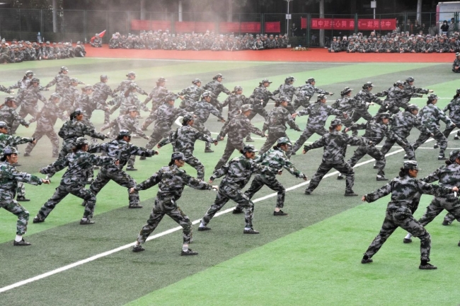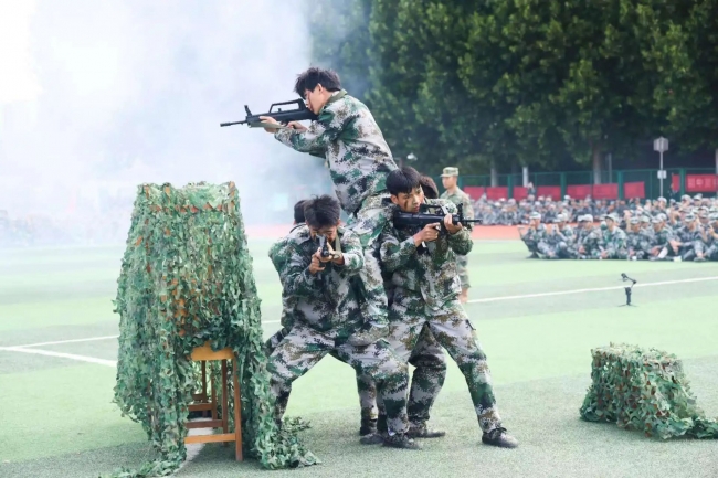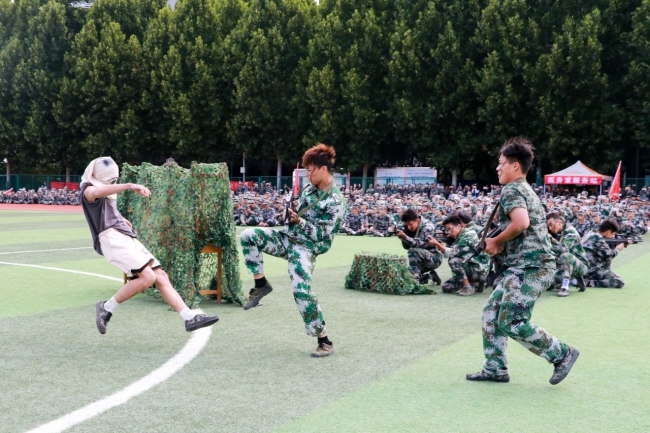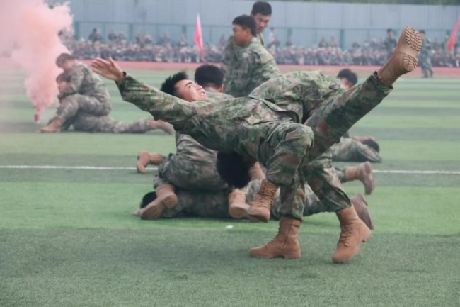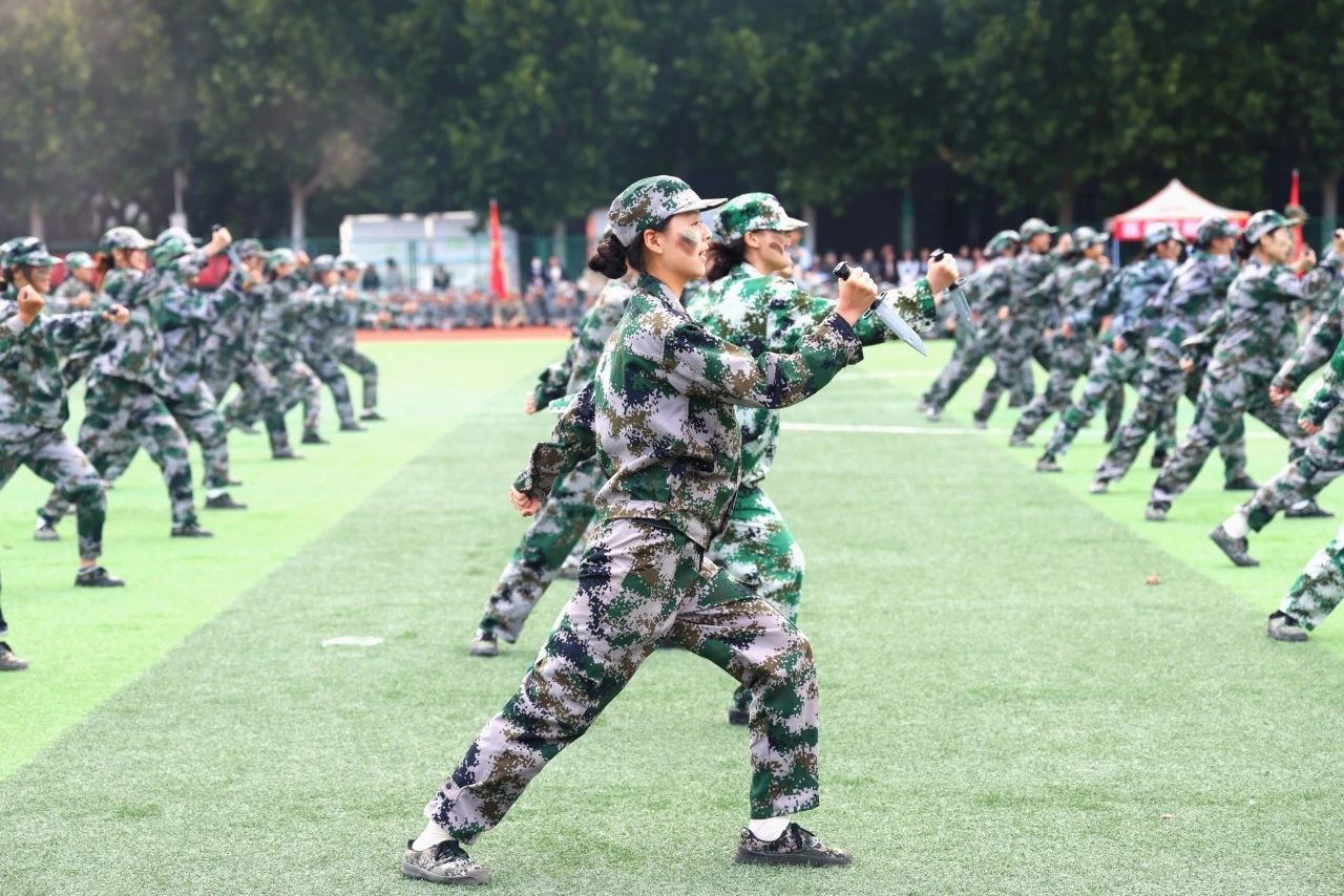 教官张超同志任指挥。首先是分列式方队展示,我校国旗护卫队在前方带队,各方队迈着整齐的步伐,喊着响亮的口号依次走过主席台。分列式后,特色军事技能方队依次展示,擒敌拳、匕首操、战术特色、教官格斗术、合唱五大特色军事训练项目精彩纷呈。